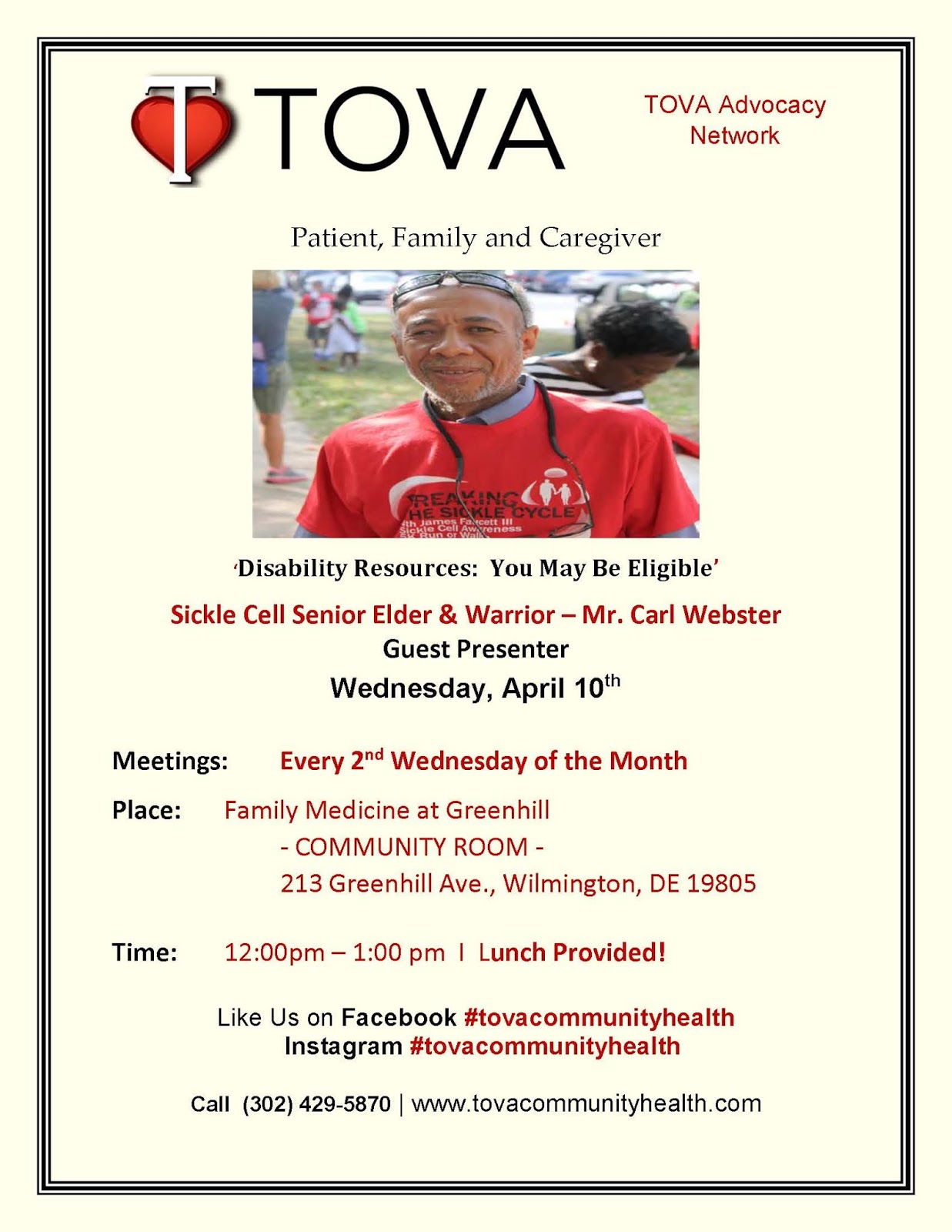 Join Us this Wednesday 4/8/2019 – Disability Resources: You May Be Eligible. Our Guest Presenter is Mr. Carl Webster -Sickle Cell Senior Elder & Warrior